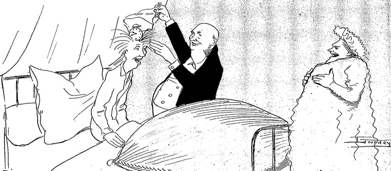 Either the doctor just found the cause of his headache, or he's hired a bedside magician.  From Le Journal Amusant, 1899.