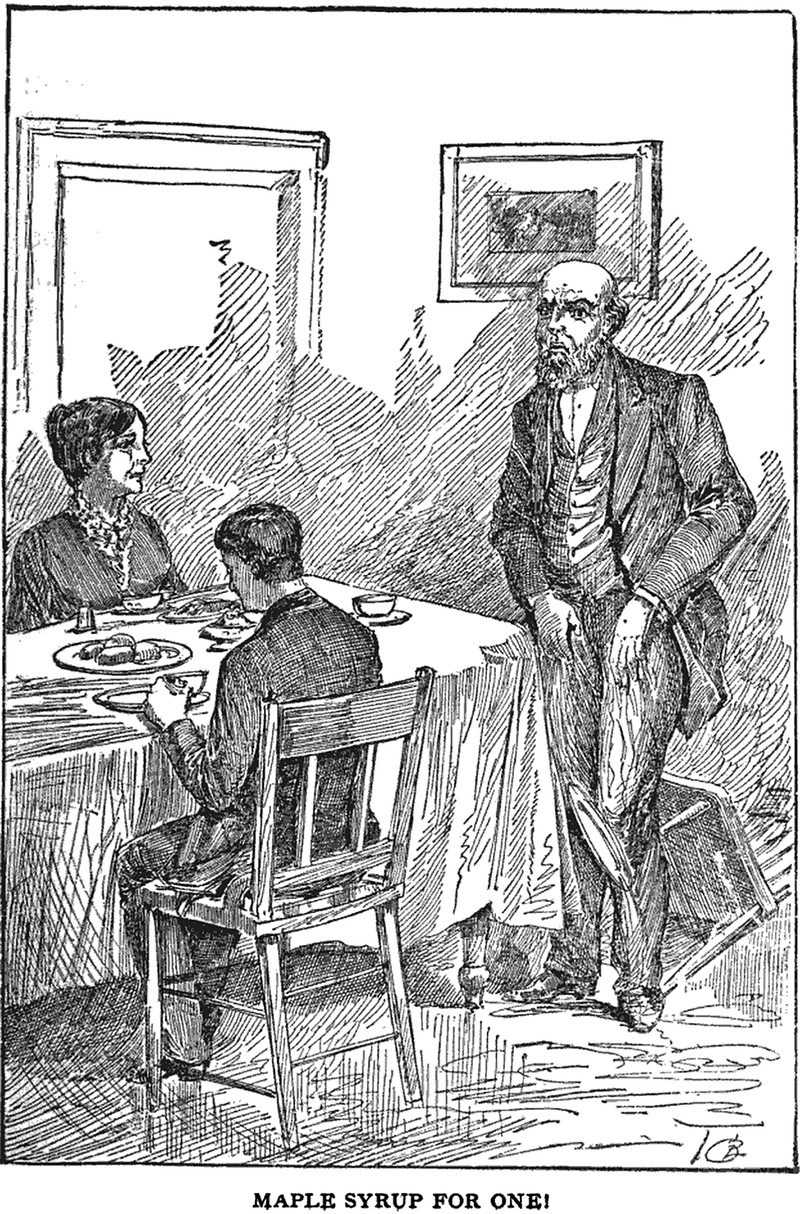 "Maple syrup for one!"  From The Grocery Man and Peck's Bad Boy by George Wilbur Peck, 1883.