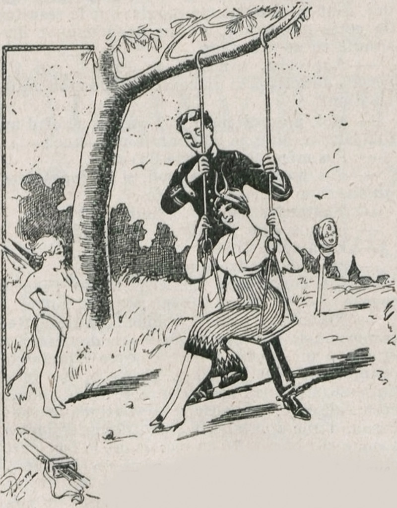 If swingers aren't careful, they can kick Cupid right out of the park.  (But that's not the caption.  There wasn't one.)  From Le Régiment, 1913.