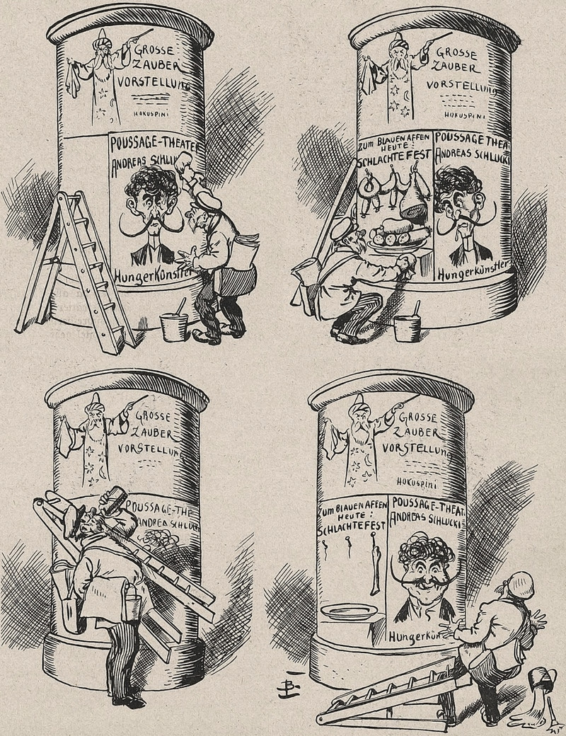City dwellers have seen this bizarre phenomeon, in which advertisment posters seem to "feed" off each other, especially in the presence of a wizard-themed poster. From Lustige Blätter, 1904.