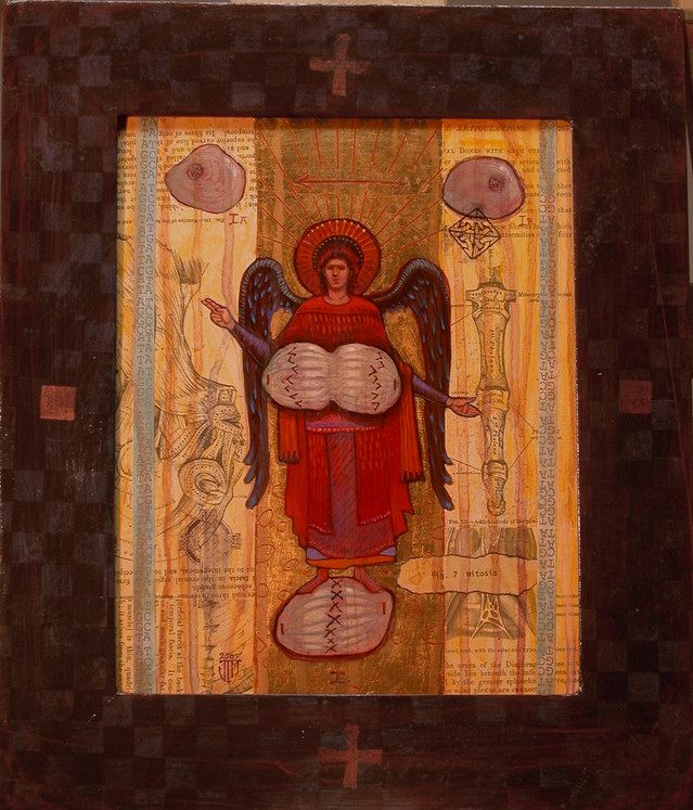 One day I was sitting thinking that there should be someone to take up the job of Patron Saint for normal cell division. Because if there is something to pray for, it's just that. And there are just so many patron saints for such unimportant things--this seemed very important. I am not catholic, nor religious for that matter, but I wanted to create an image that could be a place where science and religion could co-exist and use their powers for good.