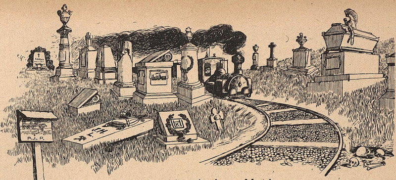 You've heard of whistling past the graveyard.  Here's a train whistling past the graveyard.  From Lustige Blätter, 1901.