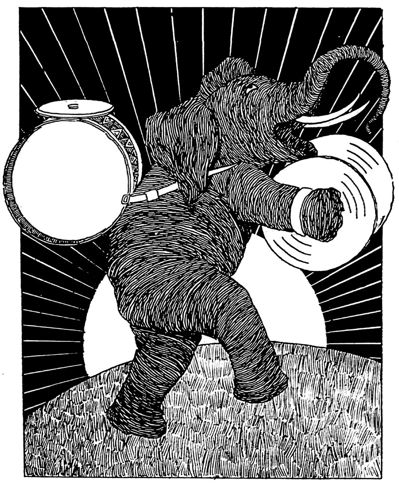 #vintage illustration #anthropomorphism #elephant #musical animal #cymbals #drums