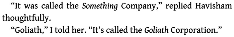 The Well of Lost Plots, there's a mega-corporation analogous to Google, called Goliath. At one point, it's referred to as "the
