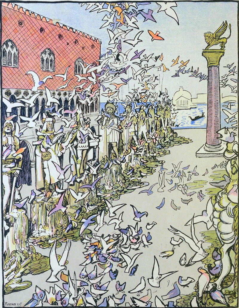 It's hard to make out, but beneath the bird droppings is Venice.  From Lustige Blätter, 1907.