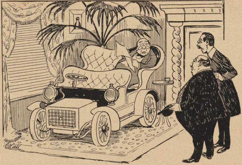Here's a precursor to Disneyland's Mr. Toad's Wild Ride, in which this style of automobile travels through interiors.  From Lustige Blätter, 1906.