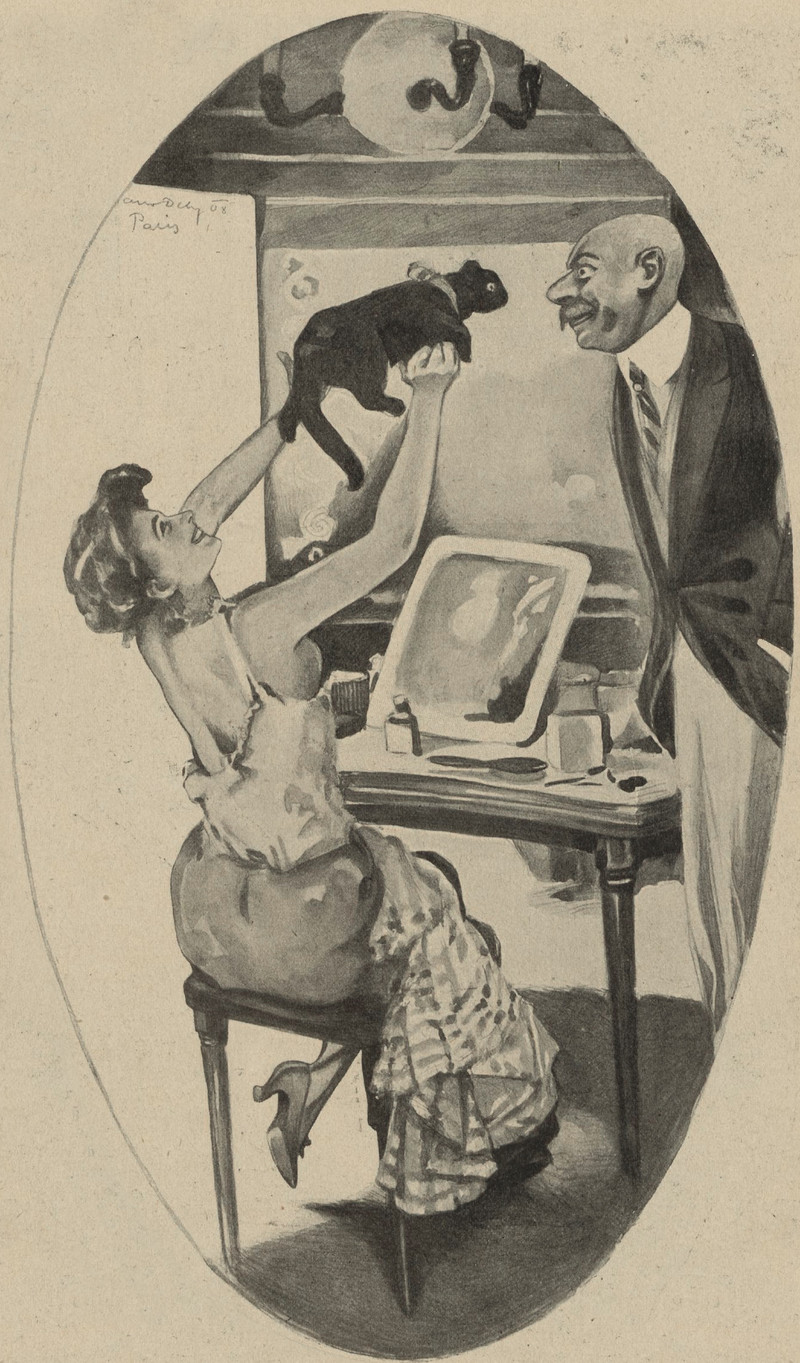 She has a becoming cat, though she has not learned How to Be Your Own Cat.  From Lustige Blätter, 1908.