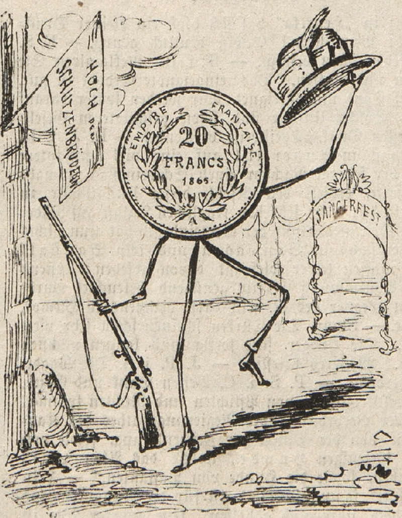 You've seen money transported in armored vehicles, but coins themselves used to be armed.  From Nebelspalter, 1876.