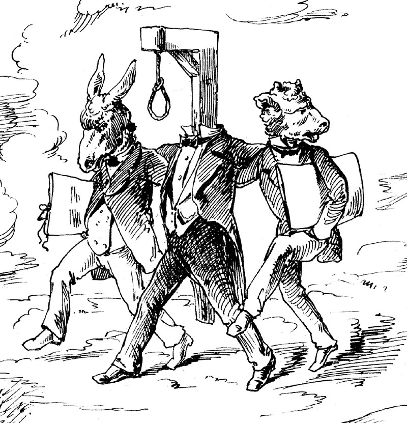 #vintage illustration #political cartoon #anthropomorphism #gallows #animal headed #hybrid #noose #1870s #art