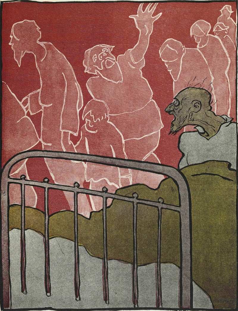 "So many ghosts, and forms of fright, / Have started from their graves tonight. / They have driven sleep from mine eyes away; / I will go down to the chapel and pray" (Henry Wadsworth Longfellow, The Golden Legend). From Satirikon, 1909.