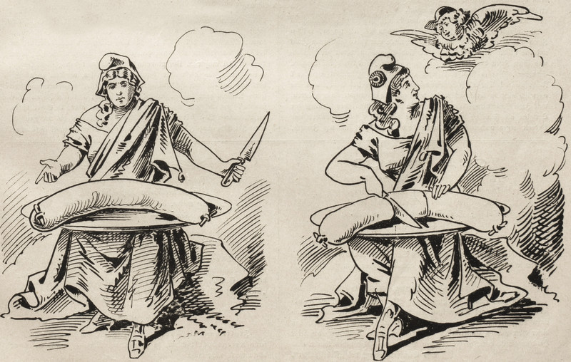 The angel who oversees sausage cutting.  From Nebelspalter, 1880.