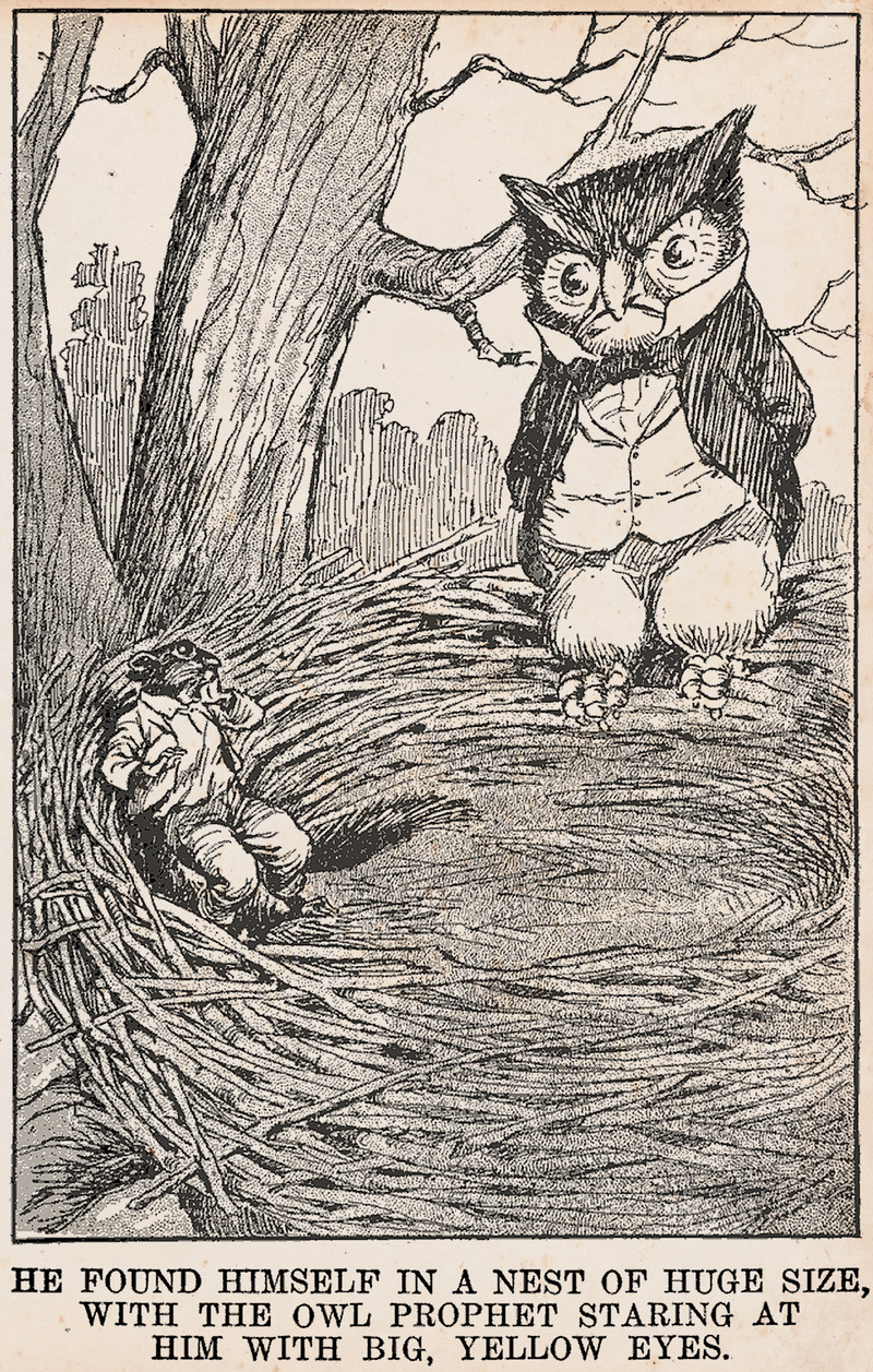 "He found himself in a nest of huge size, with the owl prophet staring at him with big, yellow eyes." From Tiny Red Squirrel by James Douglas Williams, 1919.