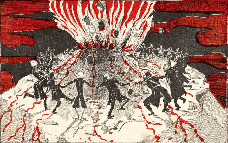 #vintage illustration #volcano #circle dance #red sky