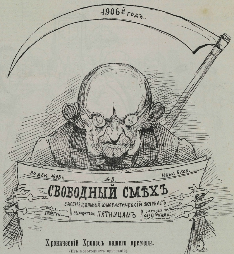Bony fingers and skulls reflected in the eyeglasses.  From Svobodnyi Smekh, 1905.