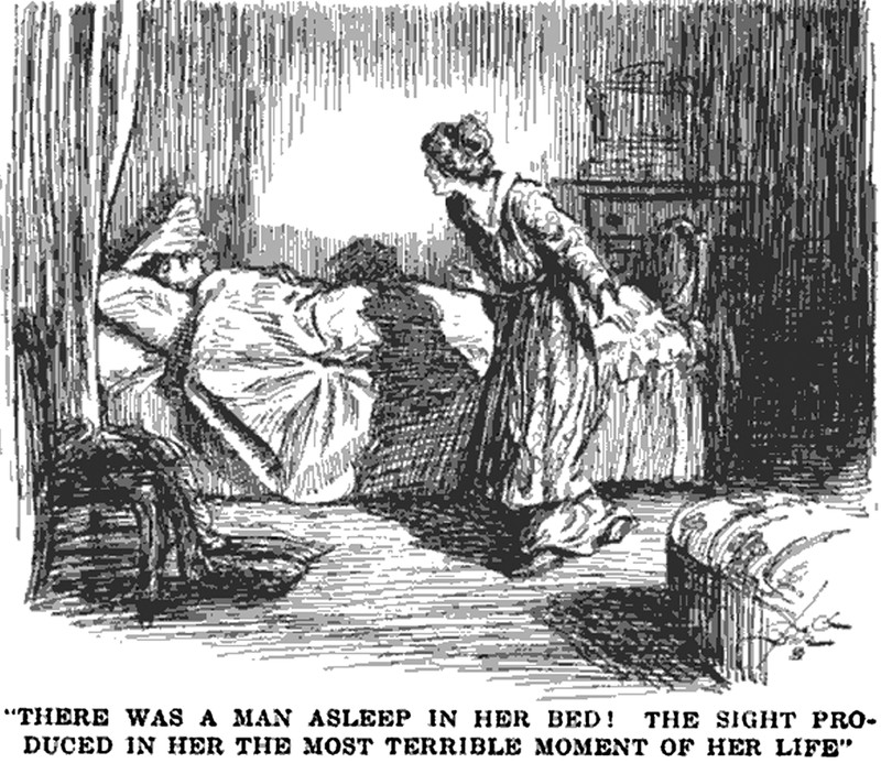 "There was a man asleep in her bed! The sight produced in her the most terrible moment of her life." An illustration by Reginald Birch. From Current Opinion, 1922.