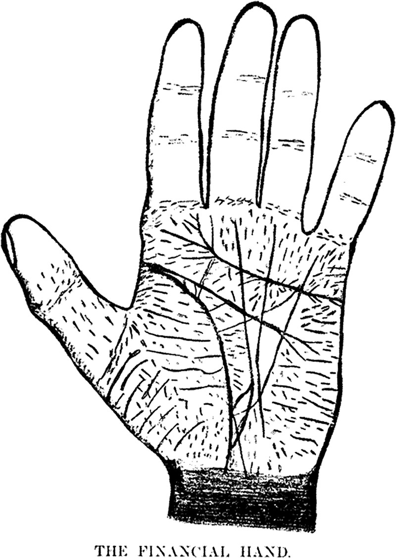 Money-grubbing requires a financial hand. The caption doesn't identify this as the hand of a manager of monetary resources. Rather, it says that the hand itself is financial. Therefore, the illustration is transformed into a talisman, akin to the Hand of Fatima. From New Discoveries in Palmistry by Joseph Bryant Hargett, 1901.