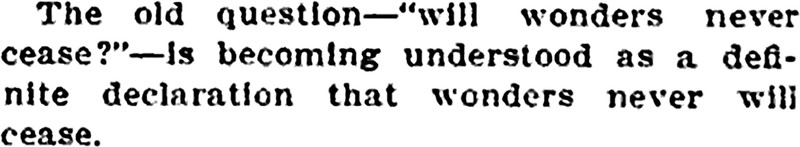 From The Shoe Workers' Journal, 1908. The text reads, "The old question—'will wonders never cease?'—is becoming understood as a definite declaration that wonders never will cease.