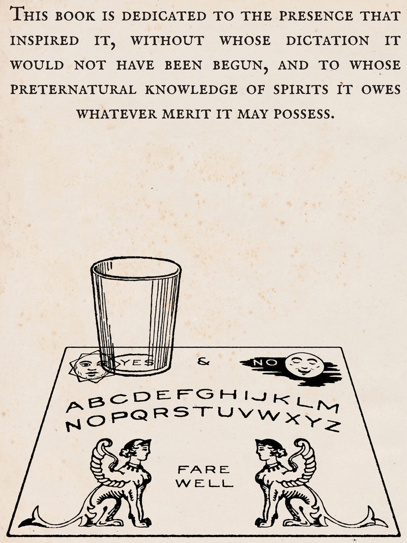 Have you ever drunk a cocktail whose recipe was dictated by a ghost? There are 112 spooky drink recipes that were communicated from the Other Side via a Ouija board, collected into Of Drinking in Remembrance of the Dead. The text on the book's dedication page reads: "This book is dedicated to the presence that inspired it, without whose dictation it would not have been begun, and to whose preternatural knowledge of spirits it owes whatever merit it may possess."