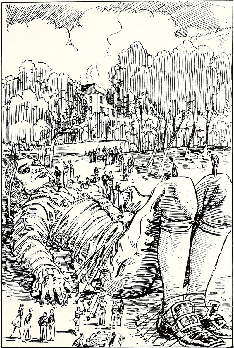 #vintage illustration #giant #gulliver #vintage yearbook #yearbook #tiny man