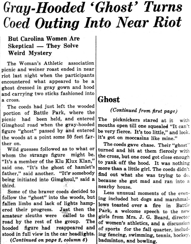 We applaud the cliffhanger at the bottom of the first column. Yet both headlines are, typical of the press, inaccurate. There's no near-riot, and the weird mystery is not actually solved (see next to last paragraph). Best detail: the location is spooky sounding: "Gimghoul Road." From Daily Tar Heel, 1939.