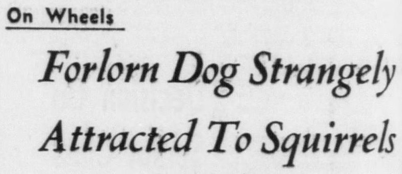 "Forlorn dog strangely attracted to squirrels -- on wheels."  From the Florida Flambeau, 1959.