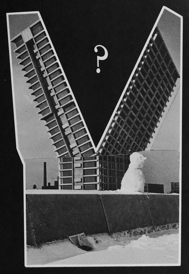 A snowman and a building split by a question mark.  From the Chicago Circle yearbook of 1969.