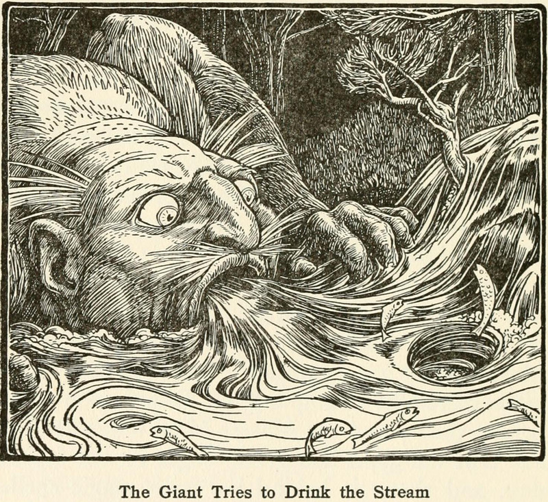 "The giant tries to drink the stream." From Europa's Fairy Tales by Joseph Jacobs and illustrated by John Batten, 1916.