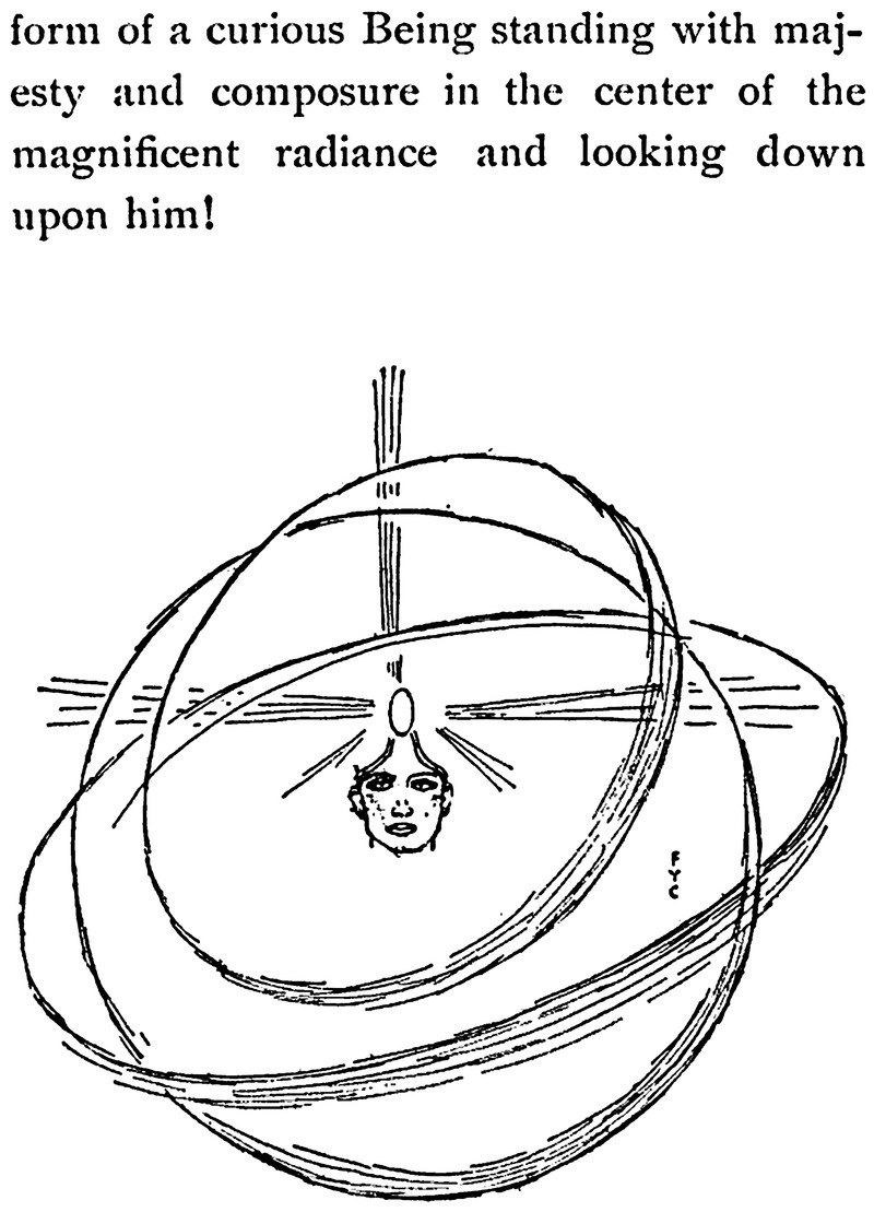 A curious being standing with majesty and composure in the center of the magnificent radience. From The Master Key by L. Frank Baum and illustrated by F. Y. Cory, 1901.