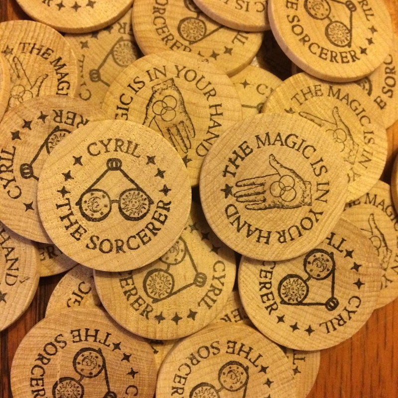 Cyril the Sorcerer, honored us with an invitation to formulate a magical coin. We jumped at the prospect of alchemical metallurgy, but this wizard added the twist that he wished to work with precious woods, not metals. He sought something less silver than sylvan. For his coin design, I was inspired by the wizard's remarkable eyeglasses. They have marvelous loops at the ends of the ear pieces. I overlapped those loops, like linking rings, to form a third eye of wizardly wisdom. The lens pieces are emblazoned with the two heavenly luminaries most associated with our planet. The coin's other side depicts an open hand reaching for a star, surrounded by Cyril's teaching that "the magic is in your hand." What a privilege to be a part of our planetary spokeswizard's enchantment!