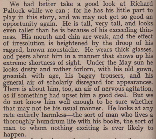 [I love this. It's sort of the opposite of an omniscient narrator—a narrator who, like an omniscient, is a disembodied device rather than a character, and yet who seems to have just wandered onto the scene without knowing much more about anything going on than the reader does. (An approach more commonly found in children's books, I suppose.)]