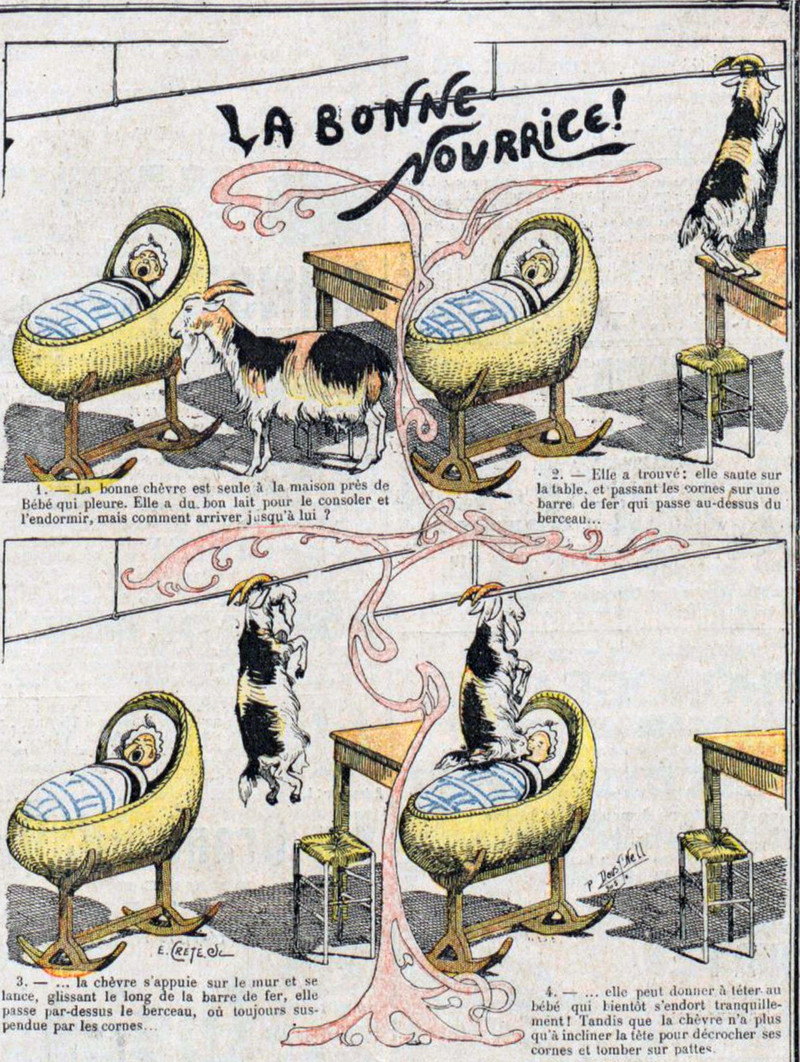 Using goats to quiet babies -- a nearly forgotten technology.  From L'Impartial de l'Est, 1905.