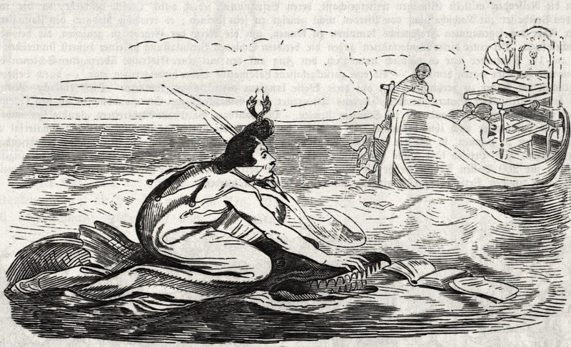 Following the printing press boat on a book-eating sea monster.  From Fliegende Blätter, 1847.