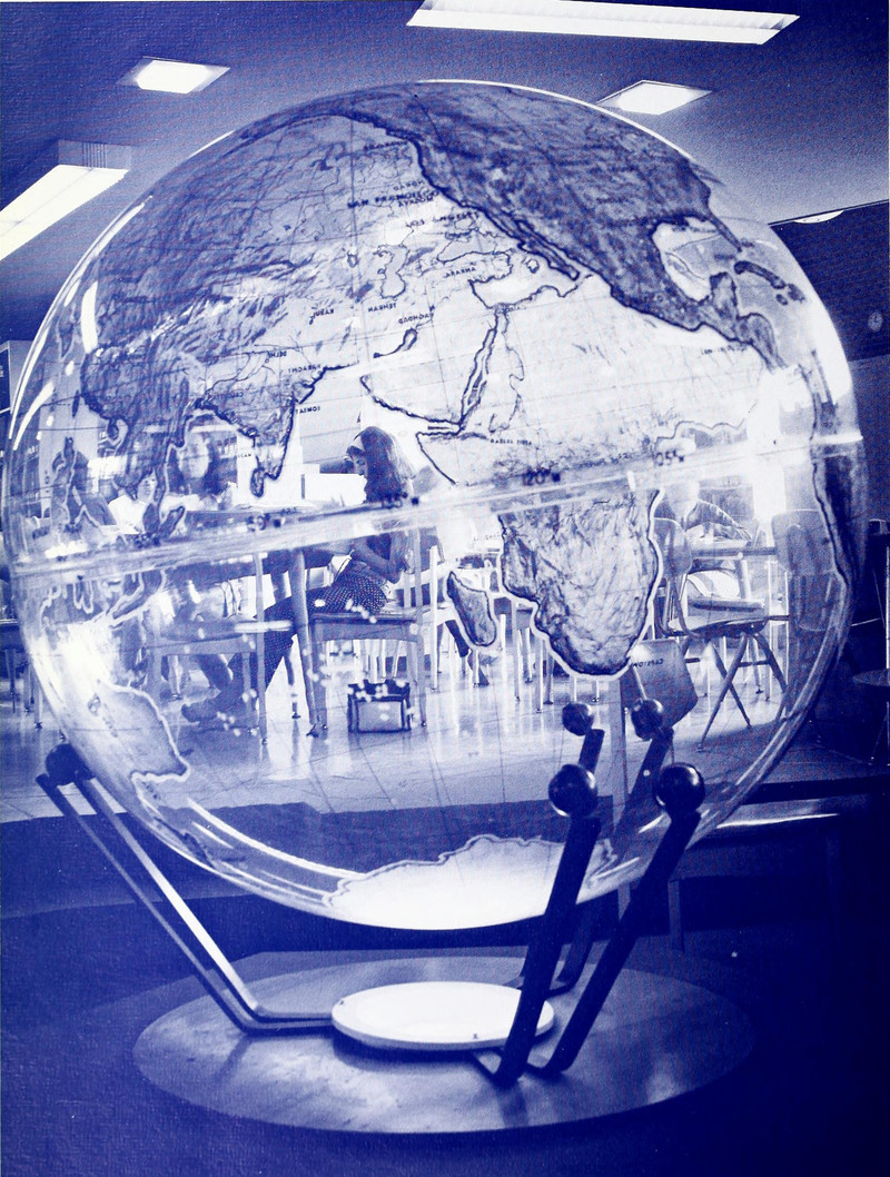 "Half of the world is transparent; the other half, opaque" (Carlos Fuentes). That means this transparent globe is half inaccurate. Then again, no map is wholly accurate. From Northeastern Illinois' yearbook of 1971.