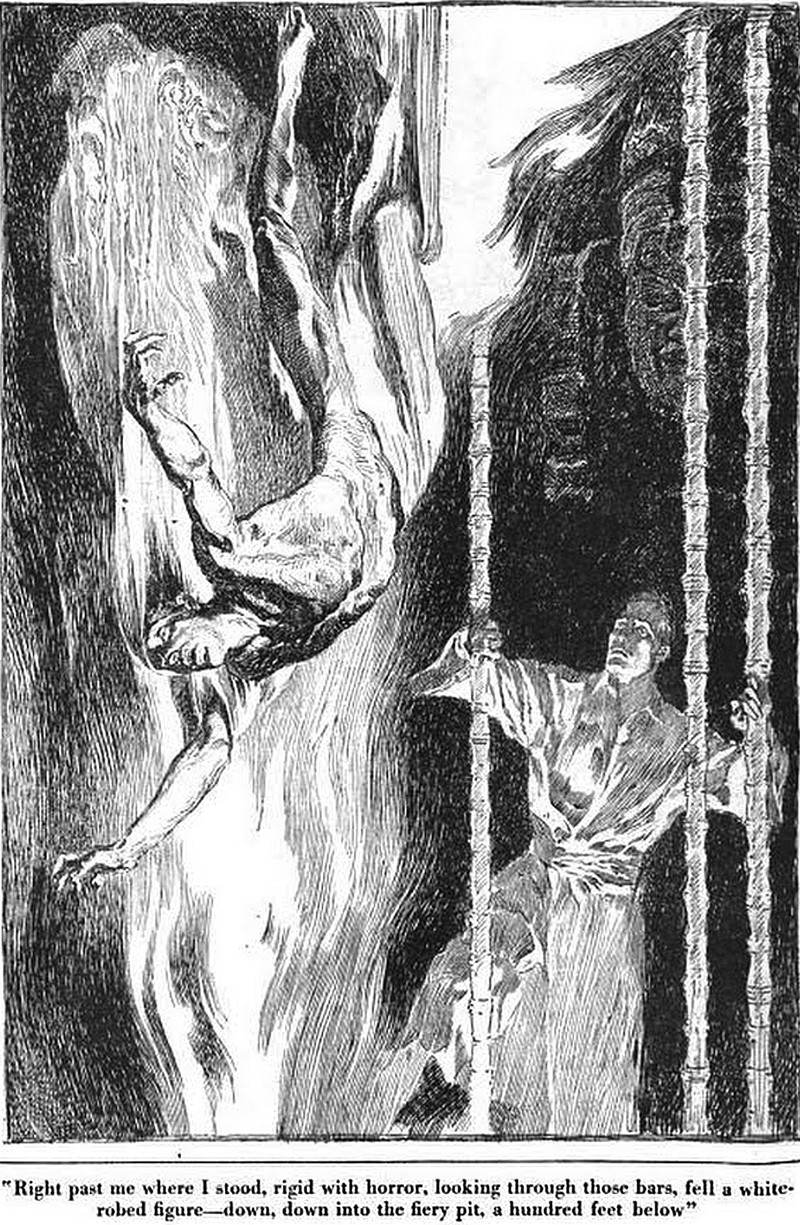 "Right past me where I stood, rigid with horror, looking through those bars, fell a white-robed figure--down, down into the fiery pit, a hundred feet below." An illustration by J. C. Coll for Collier's, 1921.
