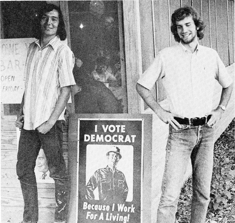 Delving through yearbooks across the decades, we're constantly reminded of how the names for the political parties flip back and forth about every 60 years.  In 1901, the democratic party fought for "free beer, free lunch, no work," whereas in the 1960s and 70s, of course, the democratic party fought for worker's rights: as in the yearbook page pictured here, "I vote democrat because I work for a living."  Today, it has all flipped again, with the democratic party again promising free beer, free lunch, and no work.