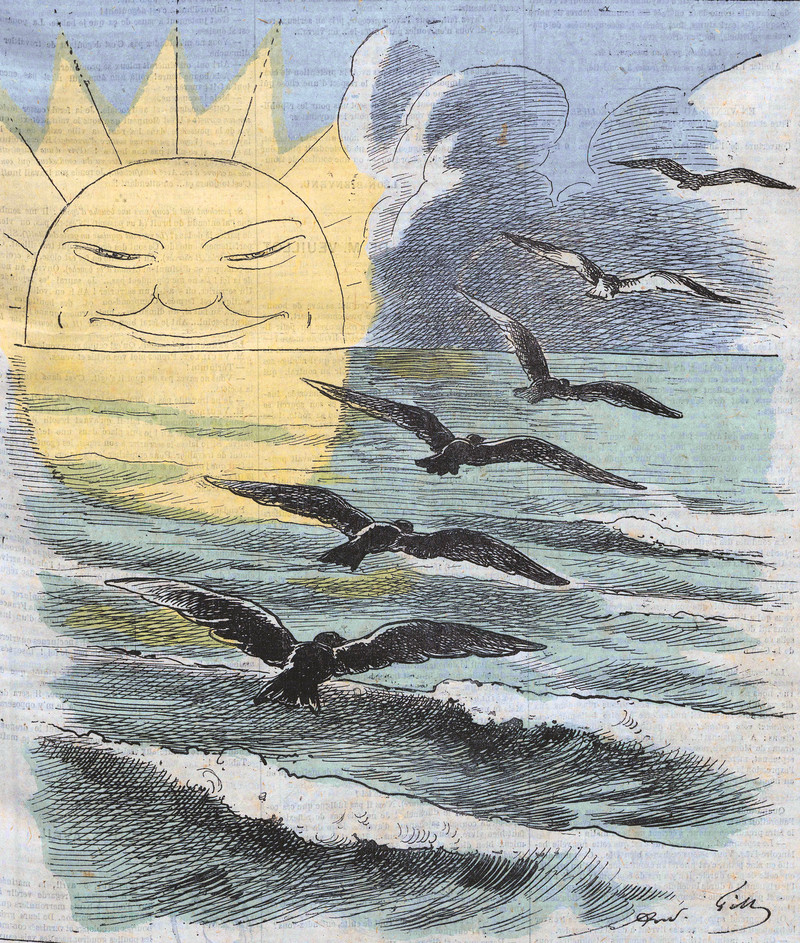 #vintage illustration #sun #anthropomorphism #birds #faces in things #ocean #sea