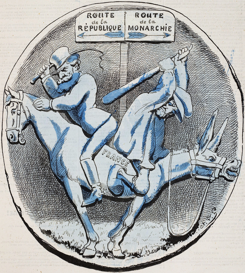 One wonders whether the deeper meaning of this cartoon was intentional, that republics and monarchies are actually two heads of the same body, that the powers that be go on profiting in any case, that the seeming helmsen are powerless to move anything, that all politics is a sham. From Le Grelot, 1872.