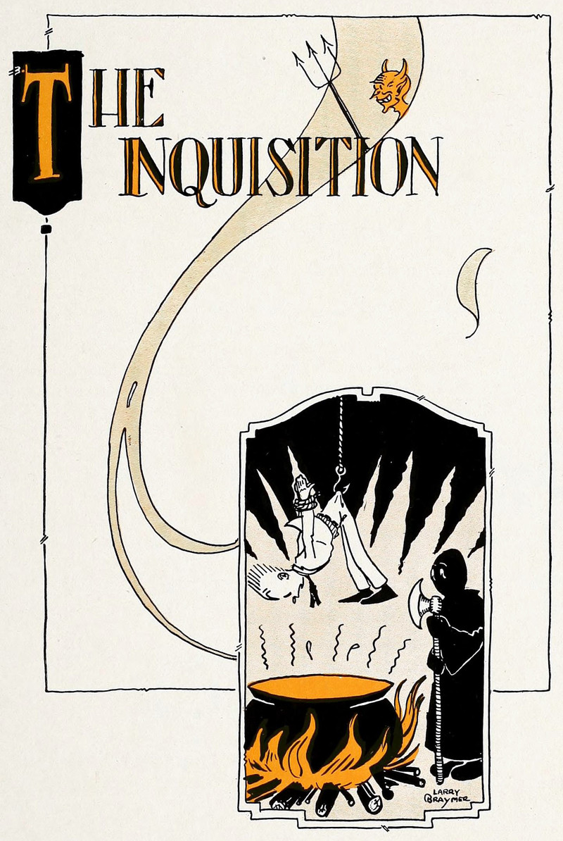 #vintage illustration #devil #cauldron #pitchfork #hell #vintage yearbook #yearbook #hooded figure #inquistion