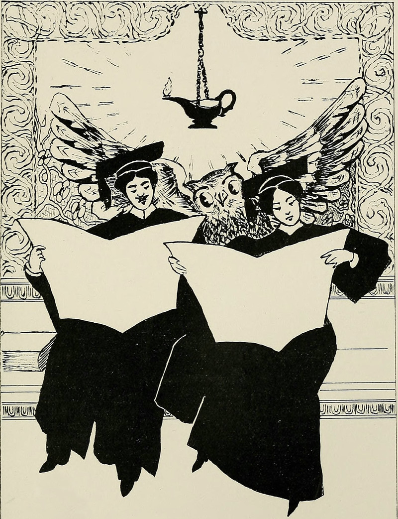 An owl reads over their shoulders.  From Swarthmore's 1897 yearbook.
