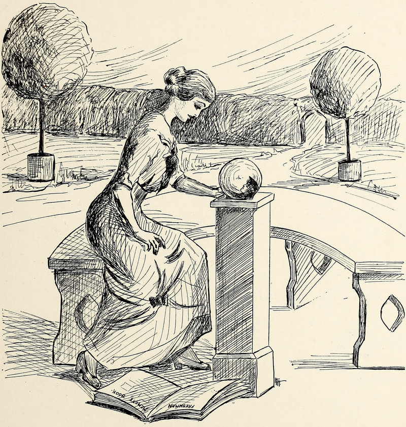 She's looking into the reflecting sphere to see if she'll graduate, but the thing about reflecting spheres, as opposed to crystal balls, is that they don't factor in wildcard timelines. From Rockford's 1914 yearbook.