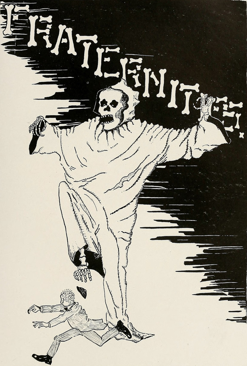 #vintage illustration #skeleton #living dead #fraternity #horror #vintage yearbook #yearbook #secret society