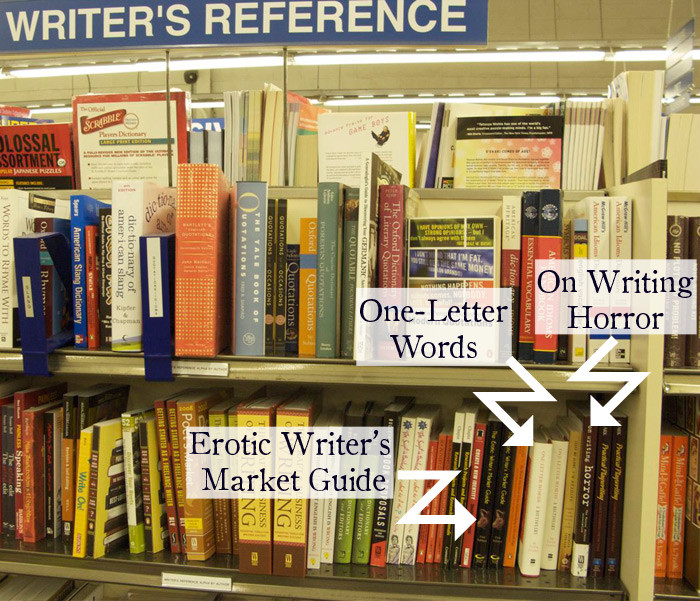 It will be hard to make out in this photo, but at this particular bookstore our One-Letter Words: A Dictionary is located snugly between Erotica and Horror. Perhaps that makes sense: "O" could be a cry of ecstasy or fright!