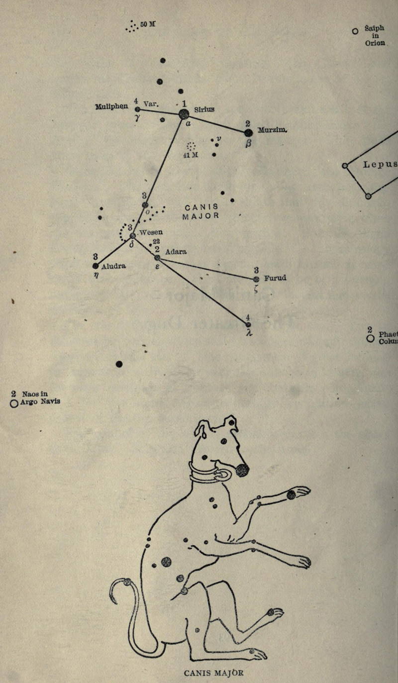 Two ways to find a cosmic canine.  From Star Lore of All Ages by William Tyler Olcott, 1911.