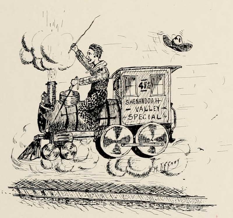 Riding an "iron horse" like a bronco -- it's surprisingly rarely depicted.  From Hampden-Sydney's 1917 yearbook.