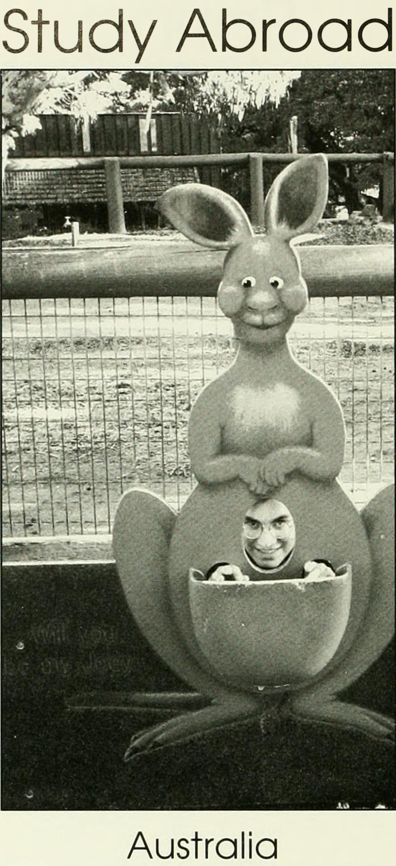 This is actually offered as "proof" of study abroad in Australia. Overlooking the offensive stereotype of the continent, a novelty cutout of a kangaroo at a zoo is perhaps even less convincing than posing with a baguette and calling it France. From Duke's 1994 yearbook.