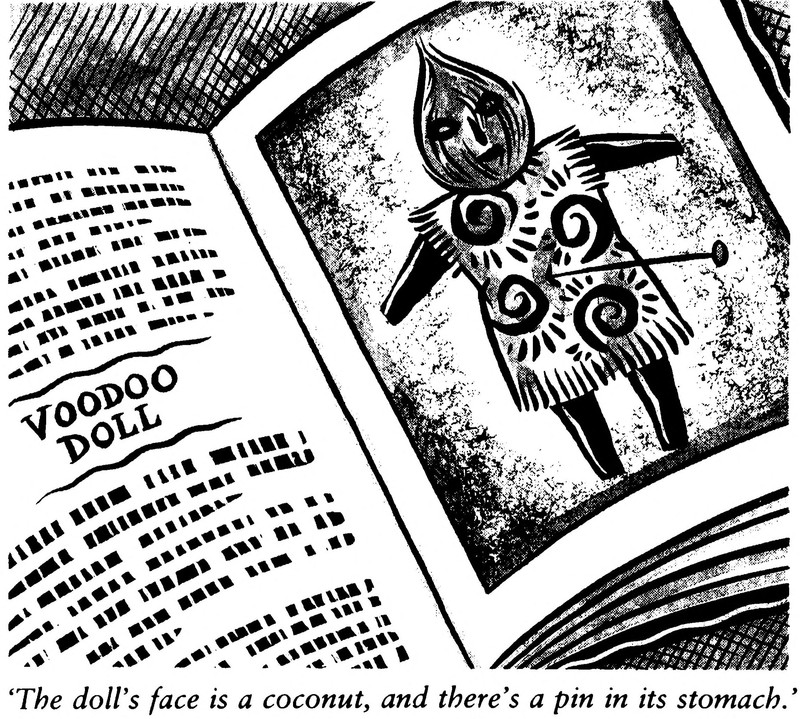 "The [voodoo] doll's face is a coconut, and there's a pin in its stomach."  From Voodoo Island by Michael Duckworth, 1989.
