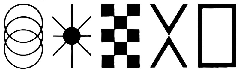 We noticed an unusual set of ESP cards in the extrasensory newsletter L'Insolite, 1980.  Instead of the classic Zener symbols of hollow circle, plus sign, three vertical wavy lines, hollow square, and hollow pentagram, here we find a checkerboard, a circle with eight rays, three overlapping rings, two V's forming an X, and a hollow rectangle.  We attempted to restore these alternative symbols in a print-resolution file for you to download.