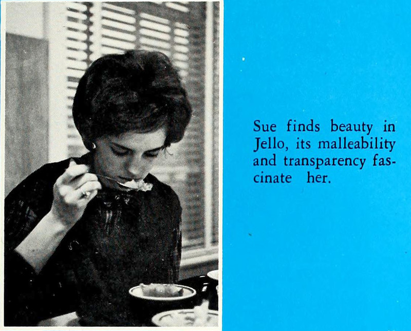 "Sue finds beauty in Jello; its malleability and transparency fascinate her."  From Lambuth's 1964 yearbook.