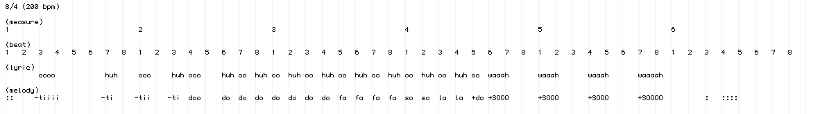 Do-Re-Midi system of text-based musical notation. The ape's call is rendered in 8/4 time (eight beats per measure) and lasts six measures. The ape's tones range from a low B to a high G (one octave plus six notes). For an explanation of the melody line and tone durations, see the