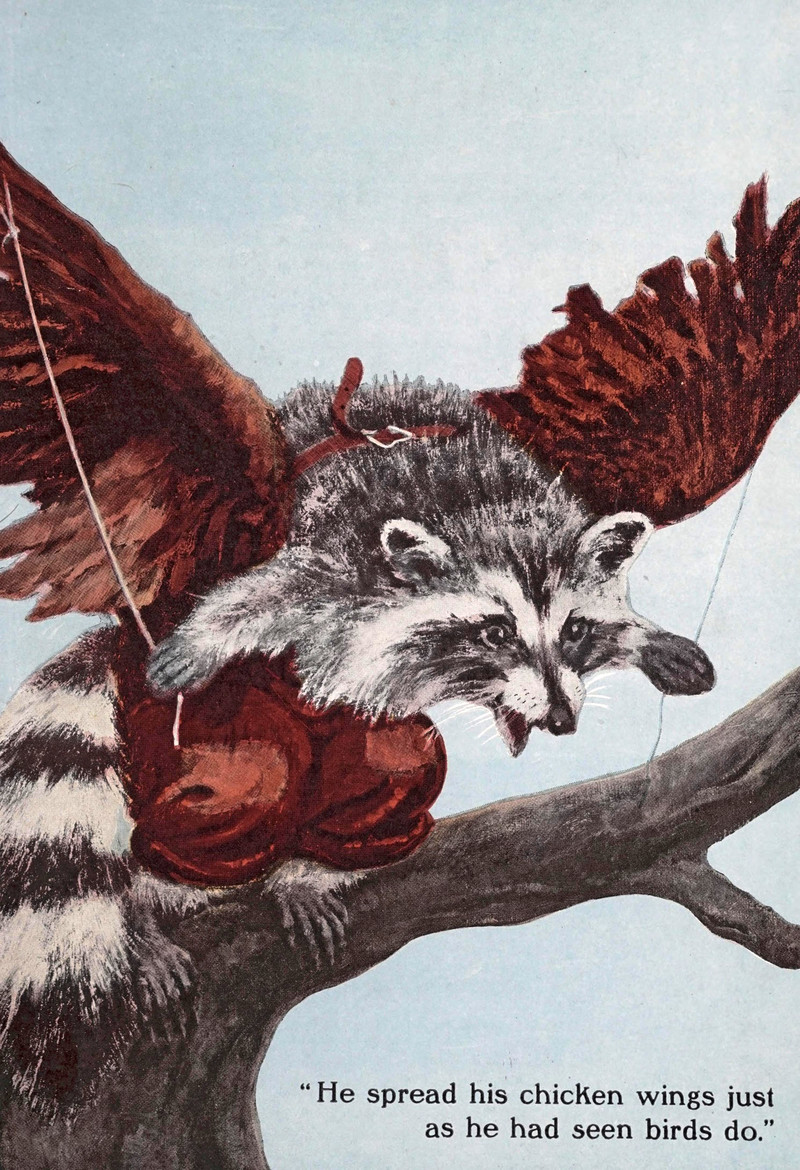 "He spread his chicken wings just as he had seen birds do."  From More Tuck-Me-In Stories, written and illustrated by Enos B. Comstock, 1922.
